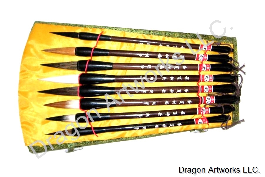 A set of eight Chinese art brushes for calligraphy or watercolor painting. Each of the bristles of the brushes in this set is made of different. In this picture, upward looking from under these brushes of this set have bristles made of bear hair, bear hair and sheep hair mixed, weasel hair and sheep hair mixed, wild god hair, sheep hair, wild dog hair, weasel hair, squirrel tail hair. Chinese art brush sets make excellent gifts for professional or aspiring artists, comes packaged in a beautiful brocaded gift box.