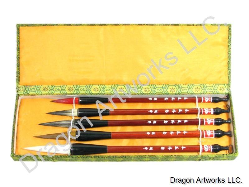 The bristles of the largest brush of this Chinese brush set is made of sheep hair. The other four brushes are made of various mixed hairs including sheep, wolf and bear. Chinese art brush set made with natural animal hair bristles and wood handles, packaged in a beautiful brocaded gift box.