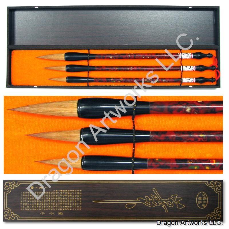 Each brush in this set of three Chinese artist paint brushes has natural bristles made of the finest quality wolf hair. Writing Chinese calligraphy and watercolor painting is an absolute joy when you are using brushes of this quality. This Chinese artist brush set comes packaged in a beautiful Chinese gift box, an excellent gift for artists or as an Asian decor item.